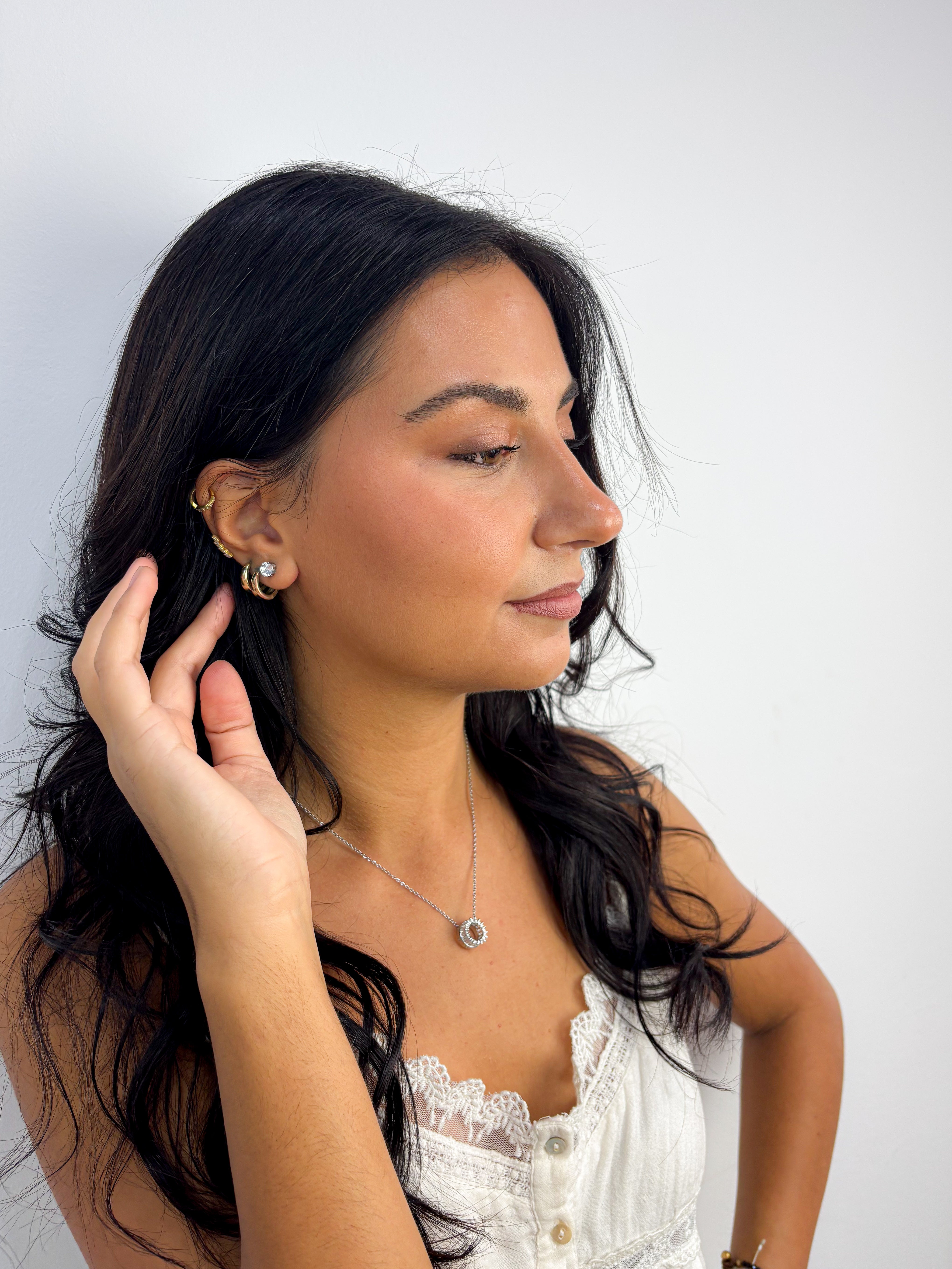 Collier Virginie, et ses boucles assorties présentent un pendentif aux proportions allongées, d’une symétrie parfaite. Sa lumière subtile et son design épuré incarnent une élégance calme, sûre et distinguée.